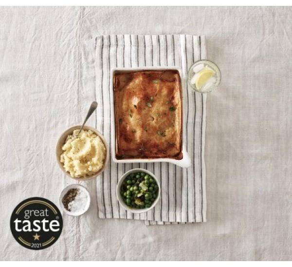 Higher-welfare British chicken and ham with sliced leeks in a cream and white wine sauce, topped with melt-in-the-mouth shortcrust pastry.