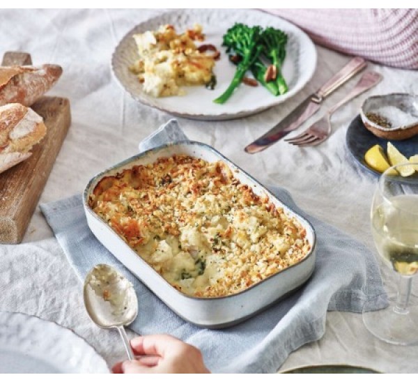 Cod and baby spinach in a classic Mornay sauce of mature Cheddar, cream and English mustard, topped with a Cheddar and Gruyère cheese crumb.