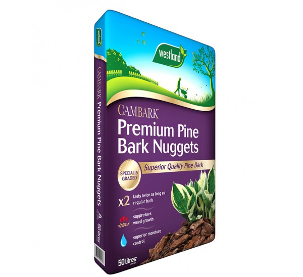 Cambark Premium Pine Bark Nuggets are specially selected and graded premium pine bark. The rich golden appearance of the bark compliments and enhances your garden