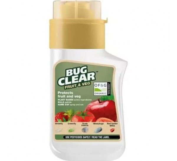 BugClear™ Fruit & Veg concentrate controls aphids, mealy bugs, red spider mites and other mites. It is ideal for use on fruit and vegetables (same day spay and eat), and for use on ornamentals. Based on rapeseed oil, the product is fully certified for use in organic gardening.