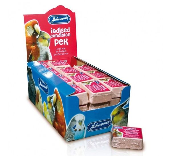 Johnson's Iodised Condition Peks are a supplementary pet food for small cage and aviary birds. These blocks contain iodine, grits, seaweed extract, calcium, yeast, vitamins and minerals to help keep your bird in the best of health.