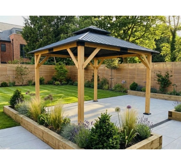 Built with a premium cedar wood frame and posts, this gazebo offers excellent strength, stability and natural resistance to outdoor conditions. The anthracite galvanised steel double roof delivers long-lasting weather protection, while the ventilated two-tier roof design improves airflow beneath the canopy, helping to reduce heat build-up during warmer weather.